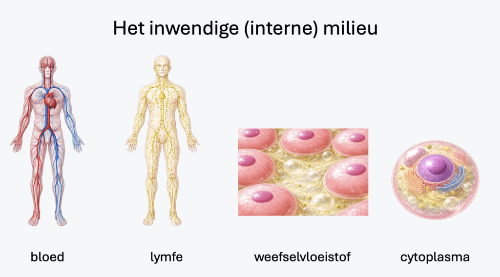 Het inwendige milieu (interne milieu) bestaat uit bloed, lymfe, weefselvloeistof en het cytoplasma van de cellen.