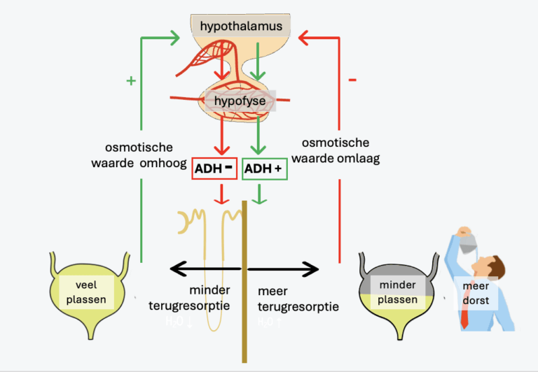 Om de osmotische waarde in het lichaam (in het interne milieu) binnen bepaalde waarden te houden, geeft de hypofyse meer/minder van het hormoon ADH af. ADH zorgt ervoor dat de doorlaatbaarheid voor water in de verzamelbuisjes van de niereenheden wordt vergroot. Daardoor wordt er meer water terug geresorbeerd. Er komt dan minder water in de urine waardoor je minder plast. De osmotische waarde kan zo bijgesteld worden. ADH regelt zo de waterhuishouding van het lichaam.